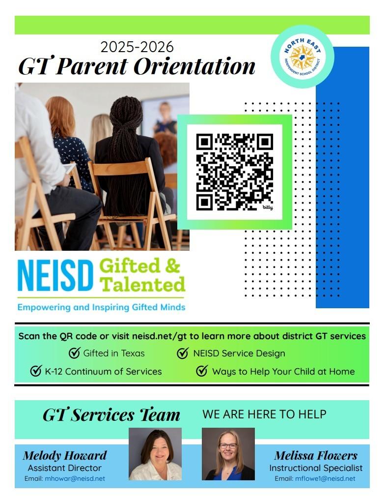Last year for the first time, our GT department no longer required individual campuses to hold their own separate GT Parent Orientation. Instead, they used a district-wide orientation video that enabled us to fulfill state requirements and alleviate the workload for you and our Secondary GT teachers. They are offering that again this year. Click on the link below to get to the video or scan the QR code in the flyer provided.